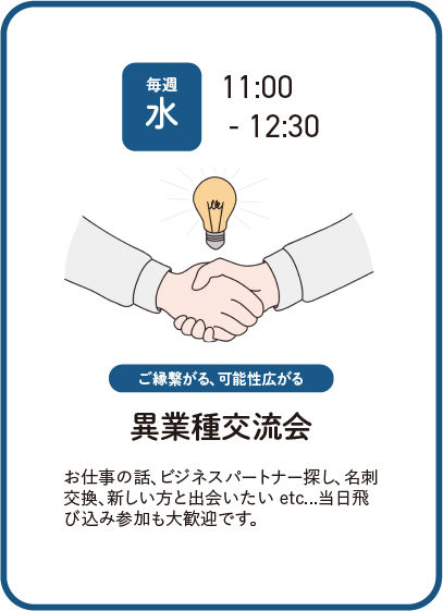お仕事の話、ビジネスパートナー探し、名刺交換、新しい方と出会いたい etc....当日飛び込み参加も大歓迎です。